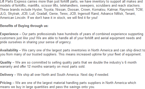 We have first-rate prices on all our lift truck parts. If you are interested in getting an estimate for our parts or attachments, give us a call today at: